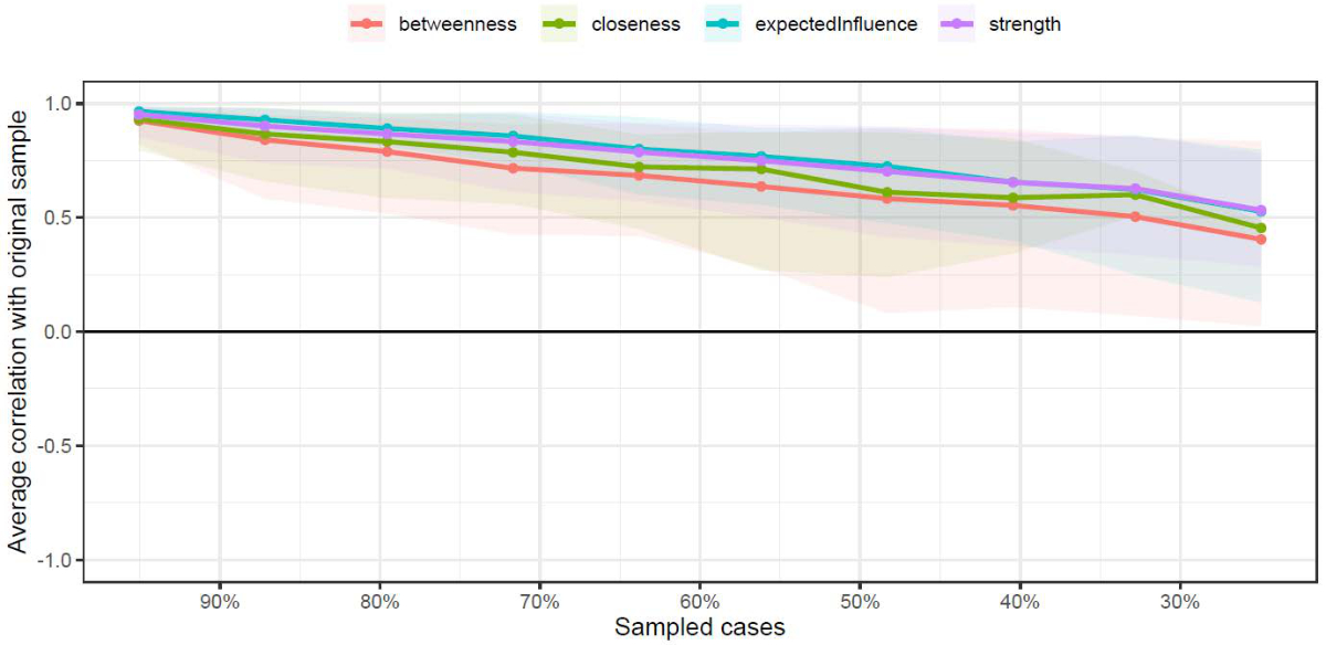 Figure S3Correlation-Stability (CS) coefficient. The figure illustrates the CS coefficient for the centrality measurements, which is used to assess how sensitive the centrality measures are to the proportion of dropped cases. The X axis shows the percentage of cases from the sample and the Y axis shows the correlation between the observed centrality measure and the computed centrality measure with the related proportion of dropped cases. The shaded area indicates 95% bootstrapped confidence intervals of correlation estimates. The centrality measures are considered stable if the CS at the correlation of 0.7 is equal or above 0.5 (i.e. that even by dropping 50% of cases we find a correlation of 0.7). In this case, the rule-of-thumb threshold is not reached, which calls for careful interpretation of the order of the centrality measures. However, it does not alter the interpretation of node centrality as centrality is highly dependent on edge weights, and LASSO regularisation ensures the existence of the edges. Moreover, the stability is affected by the sample size, and thus increasing the sample size may increase the stability of the centrality measures.