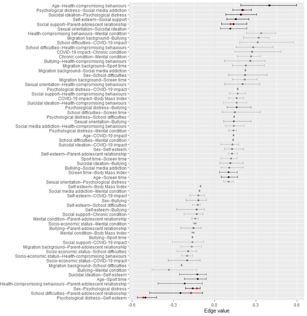 Figure S4Robustness of the estimated edge weights. This figure shows how robust the observed edge weights are when compared to the edge weights obtained through bootstrapping. The red dots indicate the observed edge weights and the black dots with the 95% confidence intervals (CIs) indicate the edge weights obtained through 800 bootstrapped simulations. The fact that the observed edge weights systematically fall within the CIs provides confidence in the accuracy of the measures. Edges equal to 0 were removed.