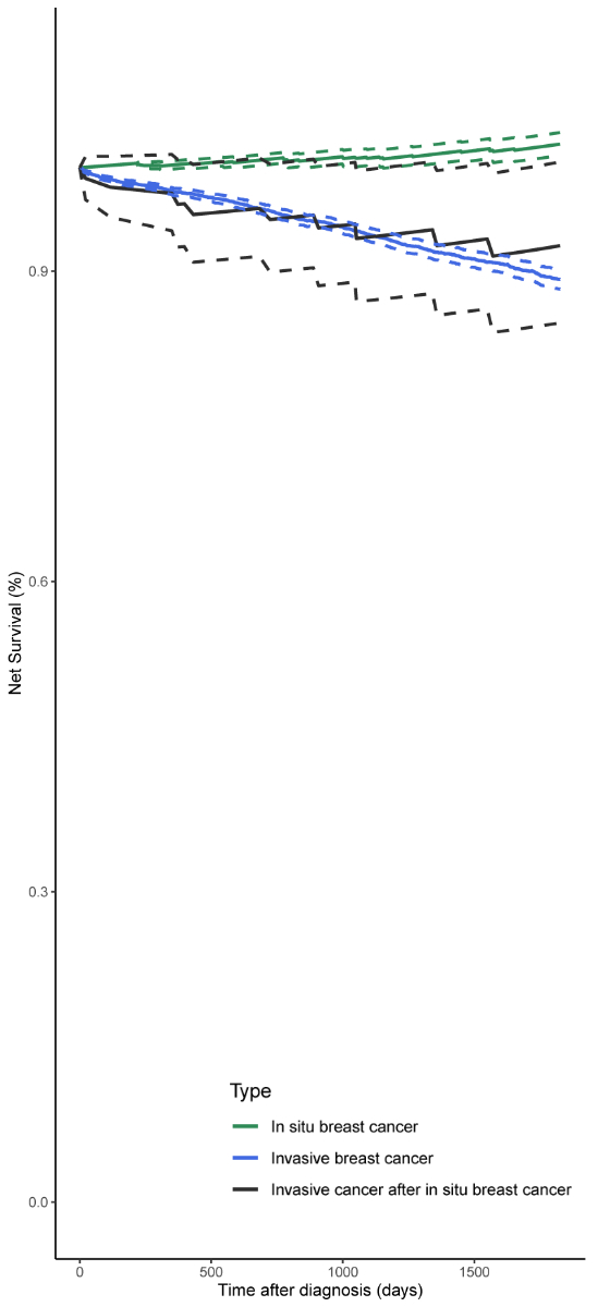 The majority of studies reported that women who were diagnosed with invasive breast cancer after breast carcinoma in situ had higher overall and breast cancer-specific mortality risk, compared to those who were diagnosed with invasive breast cancer without a previous breast carcinoma in situ [25, 27, 29, 30]. Our results showed similar net survival for patients diagnosed with invasive breast cancer after breast carcinoma in situ and those with invasive breast cancer without a previous breast carcinoma in situ, with the 95% CIs of the two groups overlapping.