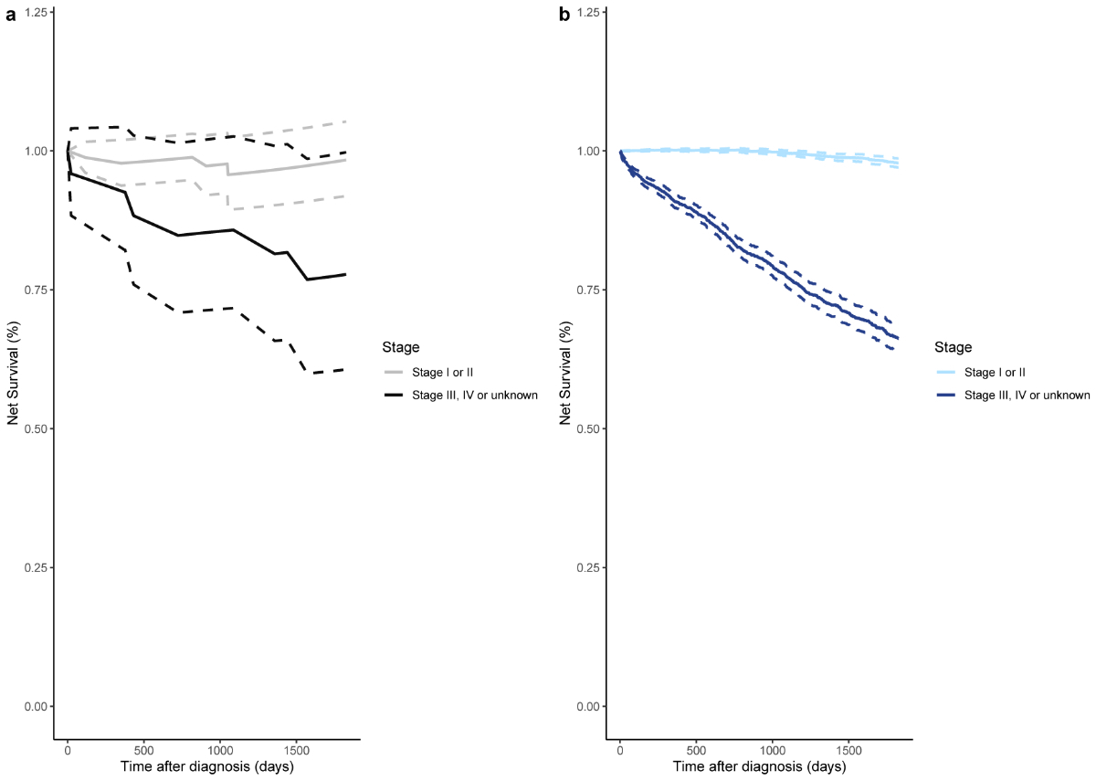 Figure 45-year net survival according to stage of invasive breast cancer: (a) Invasive breast cancer preceded by a recorded in situ breast cancer (nearly = 69, nlate = 24); (b) Invasive breast cancer not preceded by a recorded in situ breast cancer (nearly = 8927, nlate = 3352). The dotted lines represent the estimated 95% confidence interval for each study population and cancer stage group.