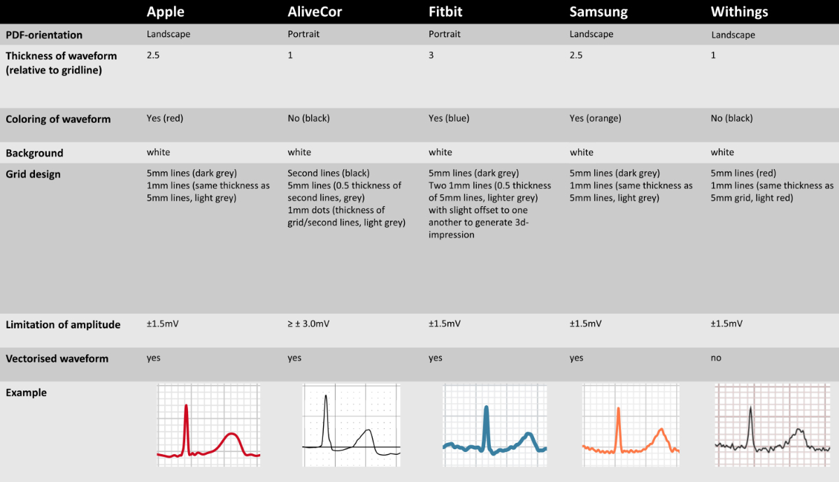 It is still being determined how the performance of manually interpreted tracings varies between different smart devices. While a frequency range between 0.5 Hz and 150 Hz has been recommended for standard 12-lead ECG [4], the technical specifications of the acquired ECG signal for the currently available smartwatches need to be clarified. There are major differences to be observed in the PDF exports of SL-ECGs from different manufacturers including the orientation of the PDF (landscape or portrait), the thickness and colouring of the waveform and the grid design. Other differences may include the maximal amplitude to be shown on the export, as well as the possibility of enhancement (vectorised or rasterised export). Figure 1 provides a brief overview of the differences between the exportable tracings of five commercially available smart devices. Compared to the standardised 12-lead ECG tracing, with its thin waveform and light grid behind it, these SL-ECG tracings differ in various aspects to what clinicians are used to in their everyday practice and this might impact the diagnostic accuracy of manual interpretation. In addition, the quality and readability of SL-ECGs might differ between different smart devices. This topic has, to our knowledge, not been systematically assessed.