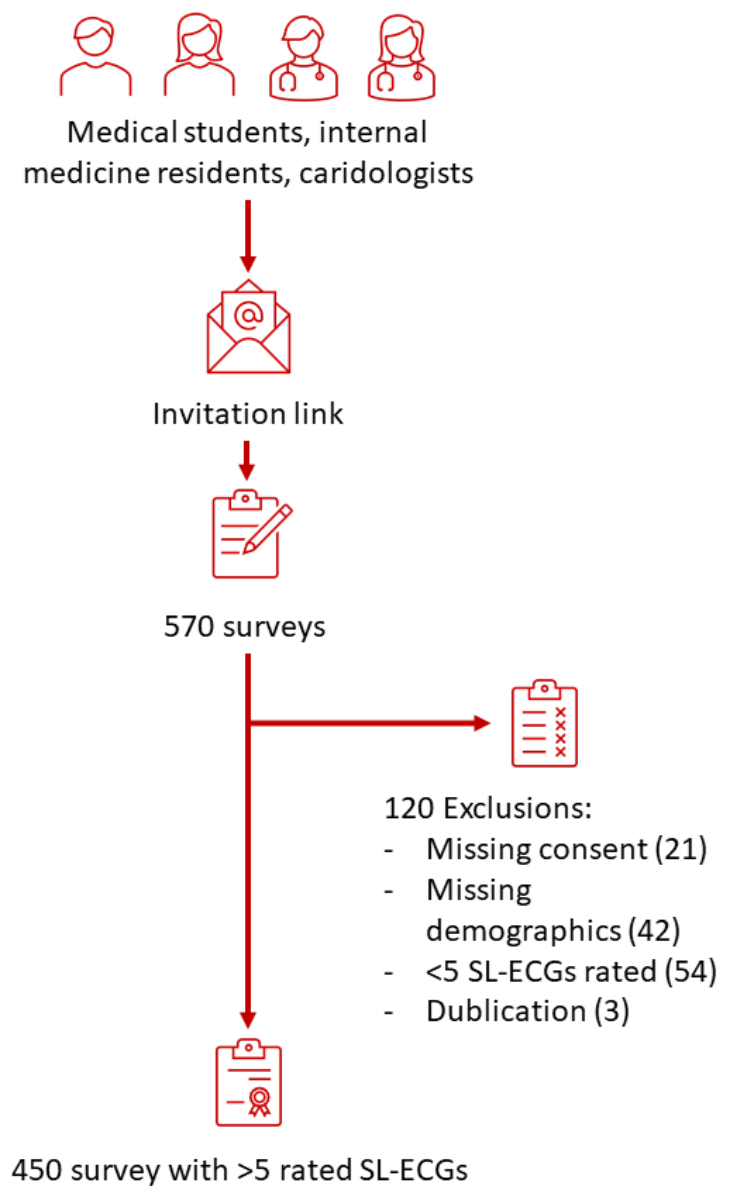 In this prospective, multicentre study, 570 participants started the survey. From these, 21 were excluded due to missing consent, 42 due to missing demographic information, 54 due to fewer than five interpreted SL-ECGs and 3 due to duplication (figure 2), leaving a total of 450 participants who were included between February and November 2022.