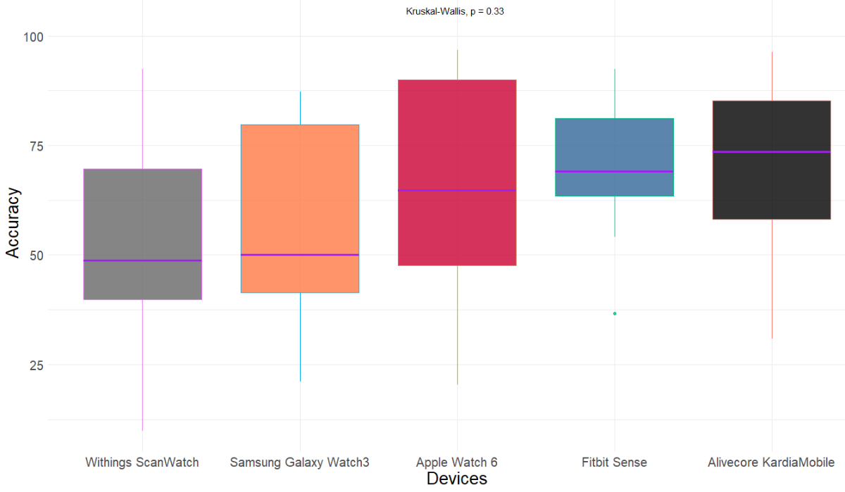 Figure 3Boxplots illustrating the diagnostic accuracy of all participants in correctly identifying atrial fibrillation for each of the five smart devices evaluated. Overall comparison with the Kruskal-Wallis test, p = 0.33. The purple line indicates the median values for each smart-device.