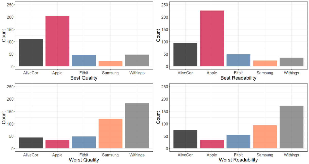 Figure 4All five smart devices were rated by all participants for best quality (top left), best readability (top right), worst quality (bottom left), and worst readability (bottom right).