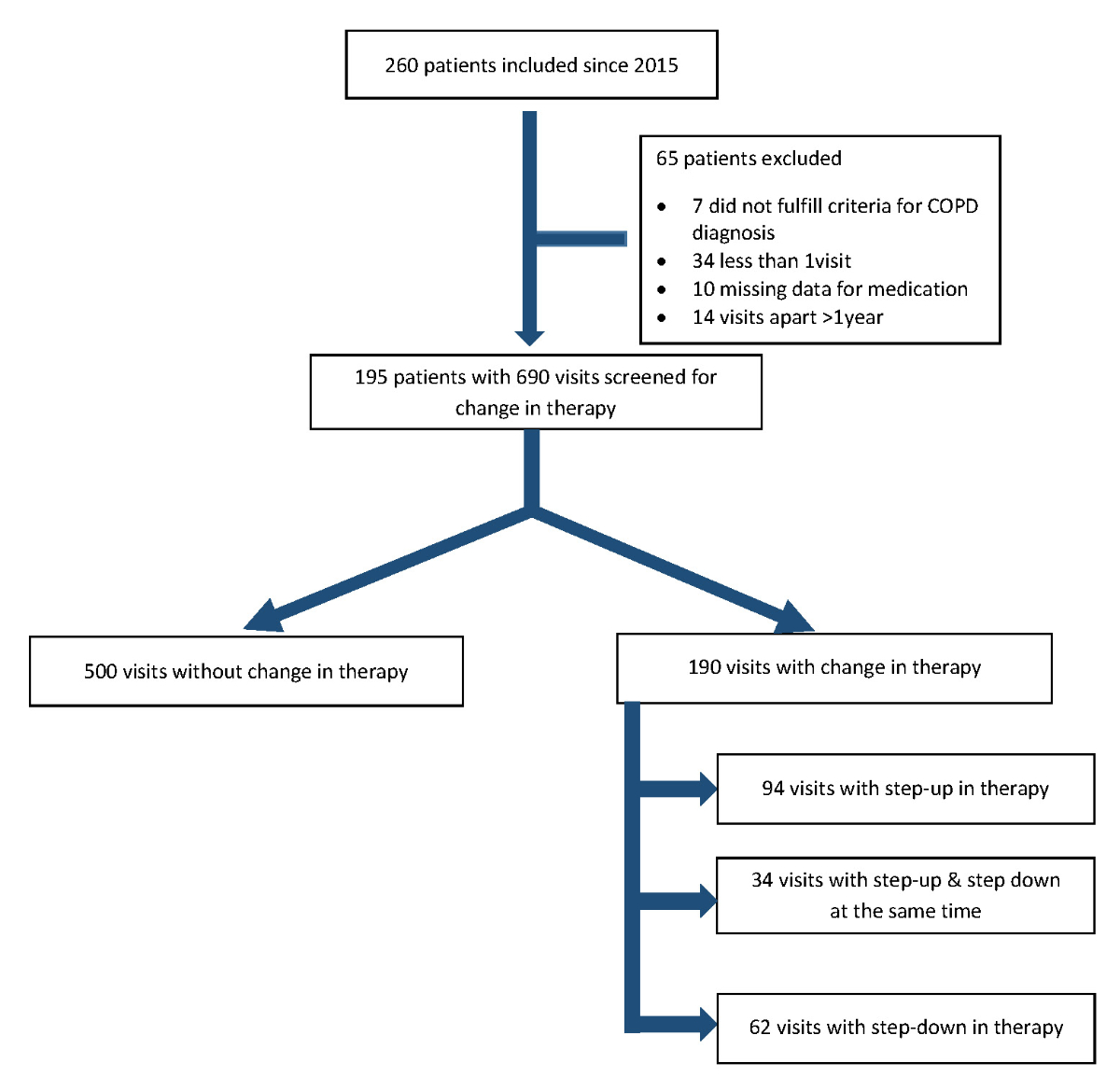The patients’ data were anonymised and were entered upon collection into a central electronic database (RDE Light) by the study team. Patients with at least one additional visit within one year of the baseline visit were included. Patients with a change in therapy were signalled to the study team, in line with the study’s objective. Our primary outcome was a change in therapy, which was defined as a change in either medication (± medication) or non-medical treatment, such as pulmonary rehabilitation. A change in medication was only counted if there was a change of substance class; i.e., a change within one substance class was not regarded as a change in therapy. Adjustments to therapy were categorised into three groups: step up in therapy, step down, and step up and step down at the same time. An example of a step up and step down at the same time is the new prescription of a long-acting muscarinic antagonist while treatment with a short-acting beta-agonist was stopped. For those patients for whom a change in treatment was detected, we sought to establish factors associated with the treatment adjustment.