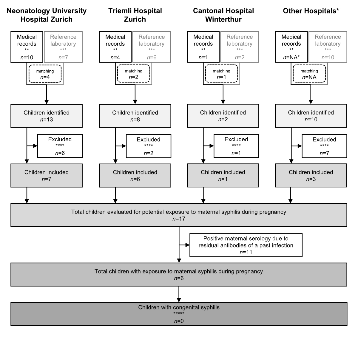 Children were identified using two complementary strategies. First, electronic medical records were systematically reviewed at each of the four hospitals for evaluation of syphilis during the study period using exactly the same algorithm, which was in line with the RECORD statement [20]. The clinical information system was screened by computer scientists applying the search terms “syphilis”, “lues” and “Treponema pallidum”. Next, the search results were reviewed by the infectious diseases specialists at the local site and they excluded (a) children of age ≥1 at the time of investigation for syphilis, (b) children born outside the study period and the canton of Zurich, (c) children with investigations for syphilis for reasons other than exposure to maternal syphilis during pregnancy, such as immunosuppression, immunodeficiency or serological investigation for Lyme disease (to exclude cross-reactivity between syphilis and Lyme screening assays) and (d) children who had the search term “lues” contained in another word (e.g. “blue spells”).