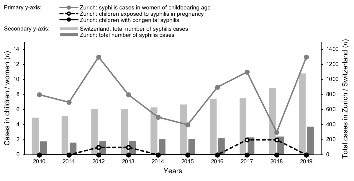 We therefore aimed to reassess the incidence of congenital syphilis in a follow-up 10-year period (2010–2019) in the canton of Zurich, the most populous canton in Switzerland with the highest incidences of syphilis [13]. Further, we evaluated the numbers of confirmed syphilis cases among women of childbearing age and the clinical management and outcome of children exposed to maternal syphilis during pregnancy in this region.