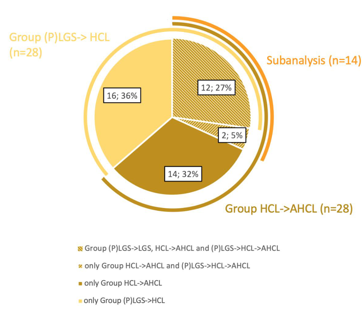 | (P)LGS → HCL group (n = 26) | HCL → AHCL group (n = 28) | (P)LGS → HCL → AHCL subgroup (n = 14) | |||||