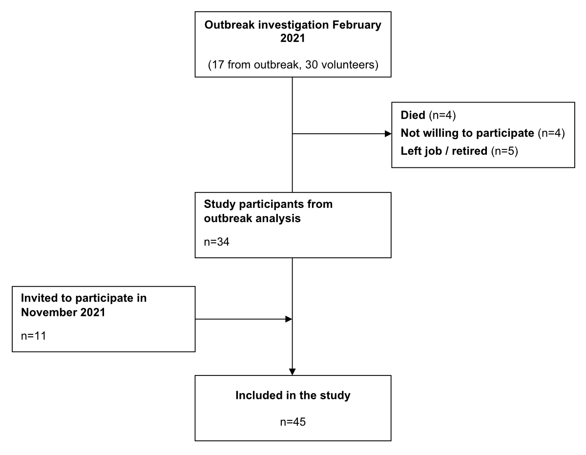 This study enrolled all staff and residents from the outbreak investigation in February 2021 [17] who were alive and willing to participate. Before the third vaccination in November 2021, we invited additional staff and residents to participate in this study. Residents with impaired judgment were not offered participation per ethics committee guidelines. The selection of study participants is shown in figure 1.