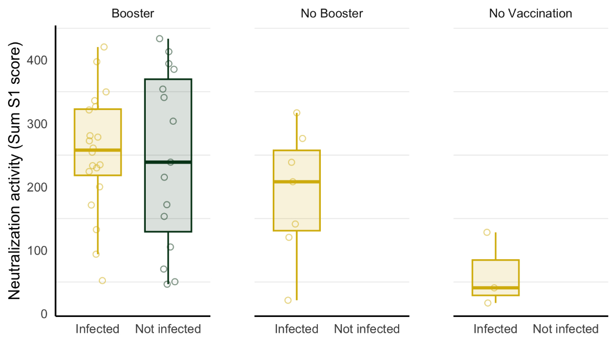 Unvaccinated participants showed the lowest Sum S1 levels, and all reported at least one SARS-CoV-2 infection episode. Despite showing considerably higher Sum S1 levels, all participants with only one or two vaccine doses also contracted SARS-CoV-2 infections, indicating that basic immunisation does not provide a sufficiently strong long-term vaccine-induced immune response to prevent infection. Previous studies described a waning in vaccine-induced immunity over time, leading to a renewed increase in infection rates [8, 14]. Our observations confirm these findings. Clinical trials found infection rates decline after introducing a third vaccination dose (first booster) [22, 24], showing that administering further vaccine doses counteracts waning. In our study, all participants who did not contract SARS-CoV-2 infections received booster vaccine doses. Furthermore, participants with hybrid immunity and booster vaccine doses showed higher predicted neutralisation activities than those without booster doses. These observations indicate that maintaining vaccine-induced immunity with booster doses is crucial for maintaining a high protective immunity level.