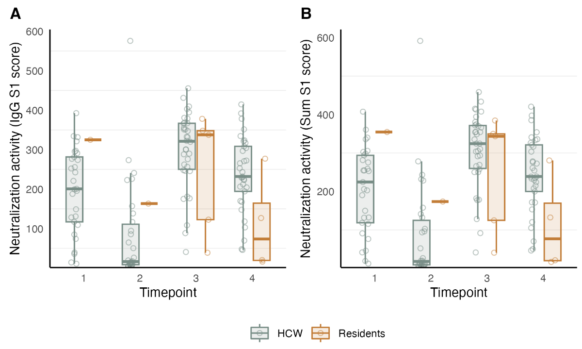 | Time point | Sum S1: HCW | Sum S1: Residents | IgG S1: HCW | IgG S1: Residents |