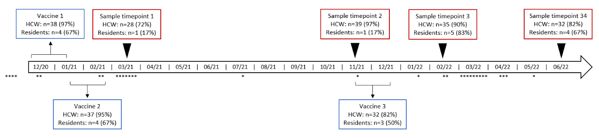 This study was conducted in a two-house nursing home in the canton of Solothurn, Switzerland, with a 93 resident capacity. The nursing home was among the first in the canton to vaccinate healthcare workers and residents. The study participants comprised six residents and 39 healthcare workers. Participants received their first COVID-19 mRNA vaccine dose (Pfizer/BioNTech, BNT162b2) in December 2020 and the second in January 2021. In February 2021, the nursing home experienced an outbreak in one house, which we investigated in a previous study [17]. Consistent with national recommendations, participants received a third vaccination – the first booster – in November and December 2021. As of June 2022, 41 (91%) participants had received basic immunisation with two doses, and 35 (78%) had received booster doses. While most participants received each vaccine dose simultaneously at the given time points, a few had slightly varying vaccine administration dates.