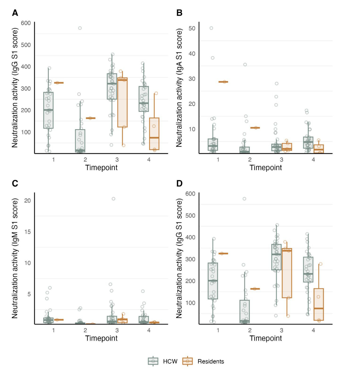 Figure S2Boxplots showing ABCORA-derived anti-S1 IgG antibodies (A), anti-S1 IgA antibodies (B), anti-S1 IgM antibodies (C), and Sum S1 reactivity signal over cutoff (SOC) values representing predicted neutralising activity (D) at time point 1 (March 2021; two months after the second vaccine dose), 2 (November 2021; 10 months after the second vaccine dose), 3 (February 2022; two months after the third vaccine dose), and 4 (June 2022; six months after the third vaccine dose) in the healthcare worker and resident groups.