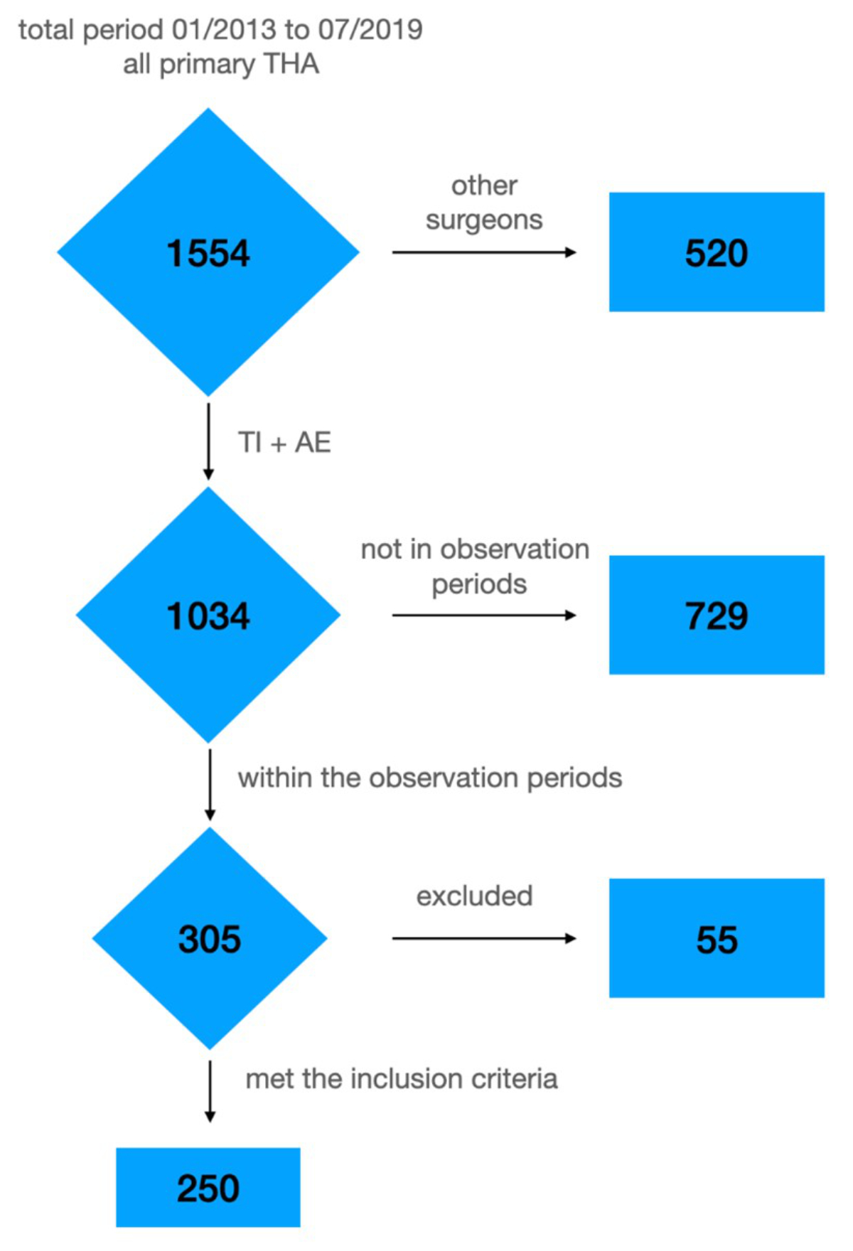Figure 1Flowchart of all hip replacements performed at the hospital and the excluded hips.THA: total hip arthroplasty; AE: Anke Eckardt; TI: Thomas Ilchmann.