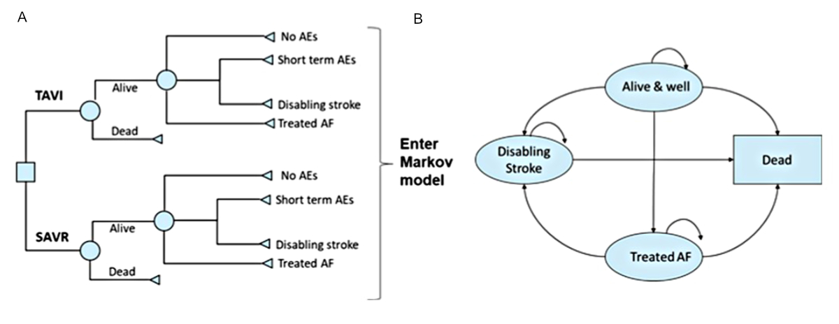 Figure 1The cost-effectiveness model had two stages: (A) early adverse events (AE) from the PARTNER 3 trial were captured in a decision tree, which fed into (B) a Markov model that captured longer-term outcomes of patients, with four distinct health states: “Alive and well” = patients have undergone the procedure and survived with only short-term or no AEs; patients in this health state can transition to “disabling stroke”, “treated AF” or “dead” at any point during the model time horizon. “Treated AF” = patients have undergone the procedure and survived but developed atrial fibrillation (AF) requiring specific treatment; this can either occur within the first 30 days or during the rest of the time horizon of the model, and patients in this health state can transition to “disabling stroke” or “dead” at any point during the model time horizon. “Disabling stroke” = patients have undergone the procedure and survived but had a disabling stroke; this can either occur within the first 30 days or during the rest of the time horizon of the model, and patients in this health state can only transition to the “dead” state at any point during the model time horizon. “Dead” is the absorbing state in the model: all patients in the model are at risk of dying due to general all-cause mortality; patients with “treated AF” and “disabling stroke” are at an increased risk of dying. SAVR: surgical aortic valve replacement; TAVI: transcatheter aortic valve implantation. Reproduced from Gilard M, et al. [14]. Value Health 2021doi: https://doi.org/10.1016/j.jval.2021.10.003, under the terms of the Creative Commons licence “Attribution 4.0 International”.