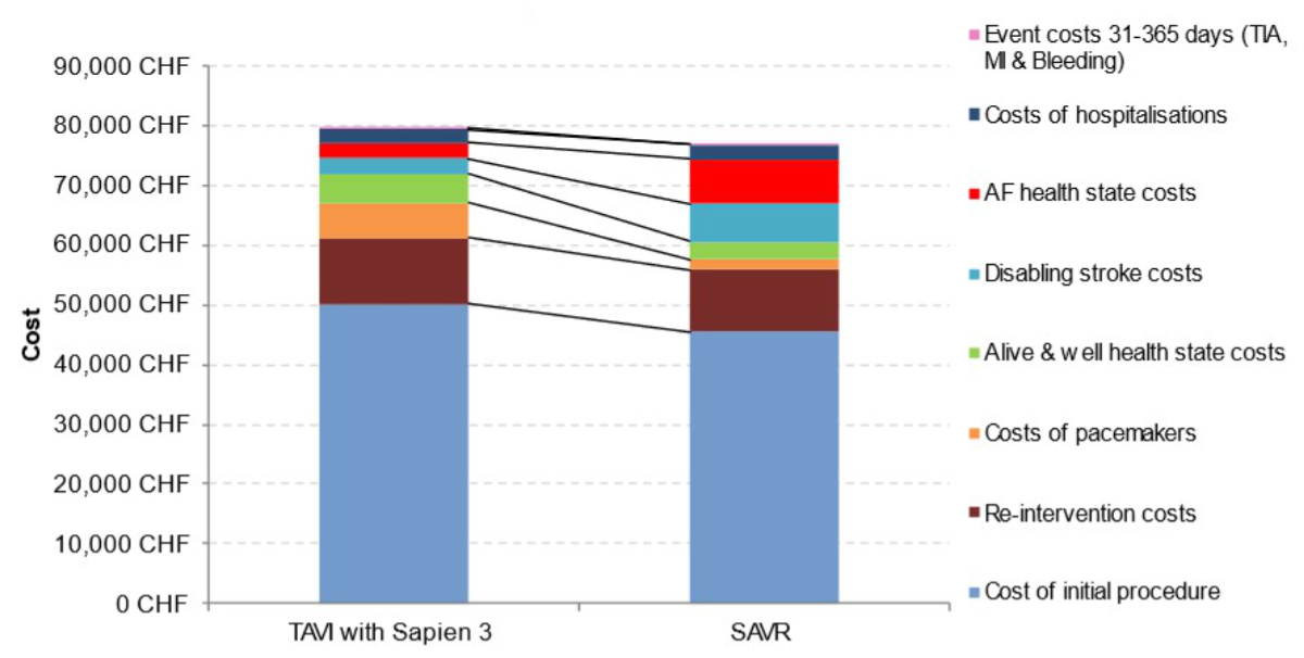Figure 2Cost breakdown for transcatheter aortic valve implantation (TAVI) with SAPIEN 3 and for surgical aortic valve replacement (SAVR). AF: atrial fibrillation; CHF: Swiss franc; MI: myocardial infarction; TIA: transient ischaemic attack.