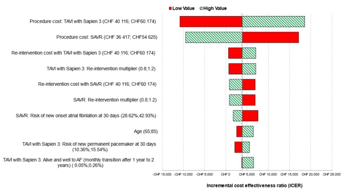 Figure 5Deterministic sensitivity analysis: Tornado diagram showing the 10 parameters with greatest influence on the model. CHF: Swiss franc; ICER: incremental cost-effectiveness ratio; SAVR: surgical aortic valve replacement; TAVI: transcatheter aortic valve implantation. Interpretation note: This chart presents the results of the 10 univariate sensitivity analyses that had the greatest influence on the model ICER. Each analysis is summarised using a horizontal bar which represents the variation in the ICER around a central value corresponding to the base case analysis as the relevant parameter is varied between two plausible but extreme values. The horizontal bars are ordered so that those with the greatest spread (i.e. parameters to which the model output is most sensitive) are at the top of the diagram, and those with the lowest spread at the bottom.