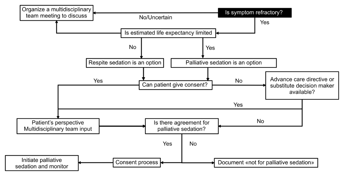 High-quality clinical research on palliative sedation is limited [7, 8, 28]. Moreover, research on the decision-making process and guidelines before administering palliative sedation differ substantially across institutions, partly due to ambiguous and variable terminology [7, 16, 29, 30]. If palliative sedation is considered and judged to be adequate and feasible by the treating physician and the multi-professional team, consultation with a palliative care specialist is strongly recommended whenever feasible. The palliative care specialist can ensure that all available alternatives for alleviating symptoms and distress have been considered and that high-quality palliative sedation is administered if selected [6]. Most importantly, a shared decision-making process involving a multidisciplinary team should be instigated whenever possible before the decision to initiate palliative sedation. Palliative sedation and potential alternatives should be thoroughly explained and discussed with the patient and, depending on their priorities, with their family or significant others. The following parameters should be evaluated based on the clinical evaluation (medical history, physical examination, and relevant investigations) of the patient: