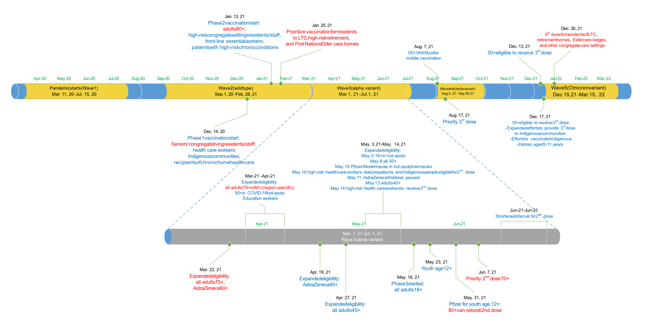 Figure 1Timeline of important events as it relates to COVID-19 waves, vaccination roll-out and vaccination eligibility.