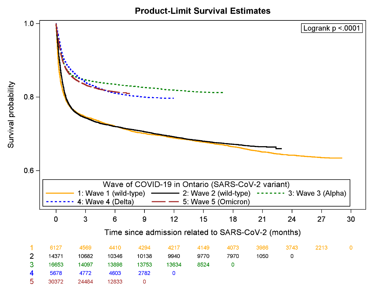 Although Omicron was more transmissible than previous variants, some studies from the United States did not report substantial differences in mortality between Omicron and Delta, even after accounting for vaccination status [5]. Conversely, other studies from England and Denmark found a lower 30-day mortality rate with Omicron after similar adjustment [6, 7]. One study from the Northeastern United States demonstrated better survival with the Omicron variant, but this finding was observed only for the BA.2 Omicron subvariant, with similar mortality between Delta and the original Omicron subvariant B.1.1.529 [8]. Generally, Canadian studies agreed that the severity of infection was lower with the Omicron variant, but more information is needed to reflect changes in severity and patient characteristics over time, and more follow-up is needed to reliably ascertain differences in mortality [9–11].
