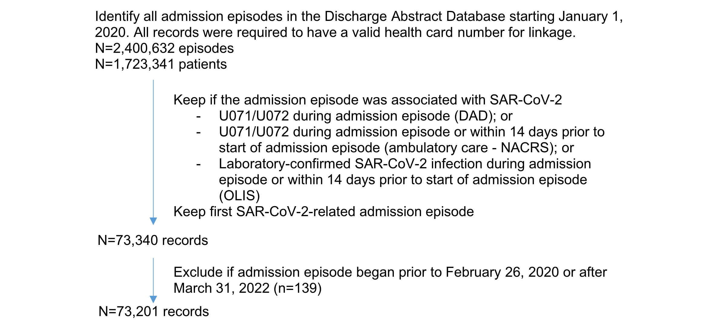 To determine whether an admission episode was related to SARS-CoV-2, we searched all diagnostic codes (up to 25) during the entire episode for the ICD-10 code U071 (COVID-19 infection, known) or U072 (COVID-19 infection, suspected). We also searched for U071 or U072 from outpatient hospital encounters (any of the 10 diagnostic codes in NACRS, the National Ambulatory Care Reporting System) during and within 2 weeks prior to the start of each admission episode [18]. Lastly, we also captured positive SARS-CoV-2 polymerase chain reaction or rapid antigen tests from the Ontario Laboratories Information System (OLIS). OLIS includes data from approximately 90% of labs in Ontario conducting SARS-CoV-2 tests since the start of the pandemic [19]. We considered an admission episode to be related to SARS-CoV-2 if any source indicated SARS-CoV-2 positivity during (DAD, NACRS, OLIS) or within 2 weeks prior (NACRS, OLIS) to the admission episode (Technical Appendix). Since our index date is the first admission related to SARS-CoV-2, we did not apply a hierarchy to these sources of evidence. The first ever admission episode was retained per patient.