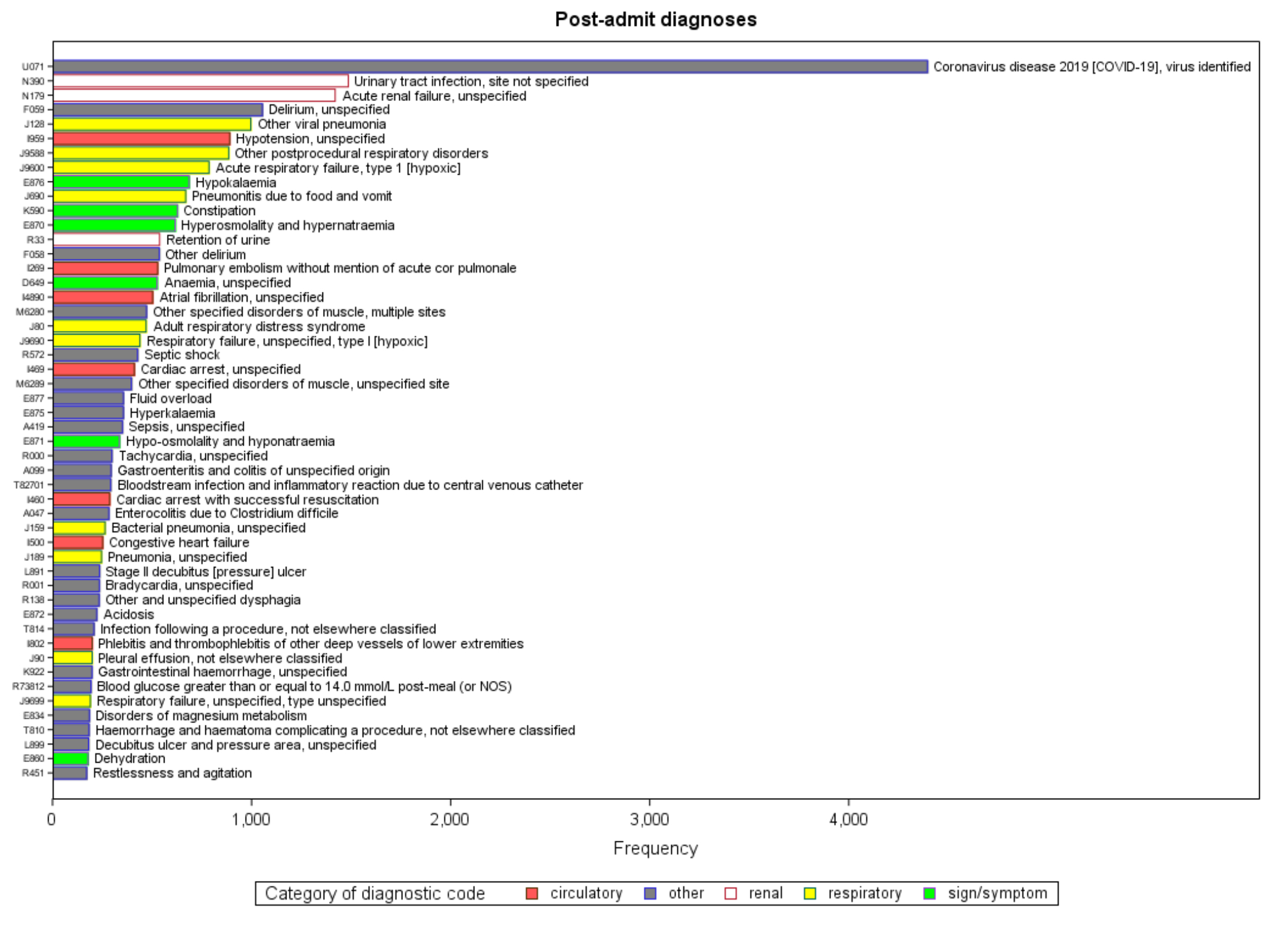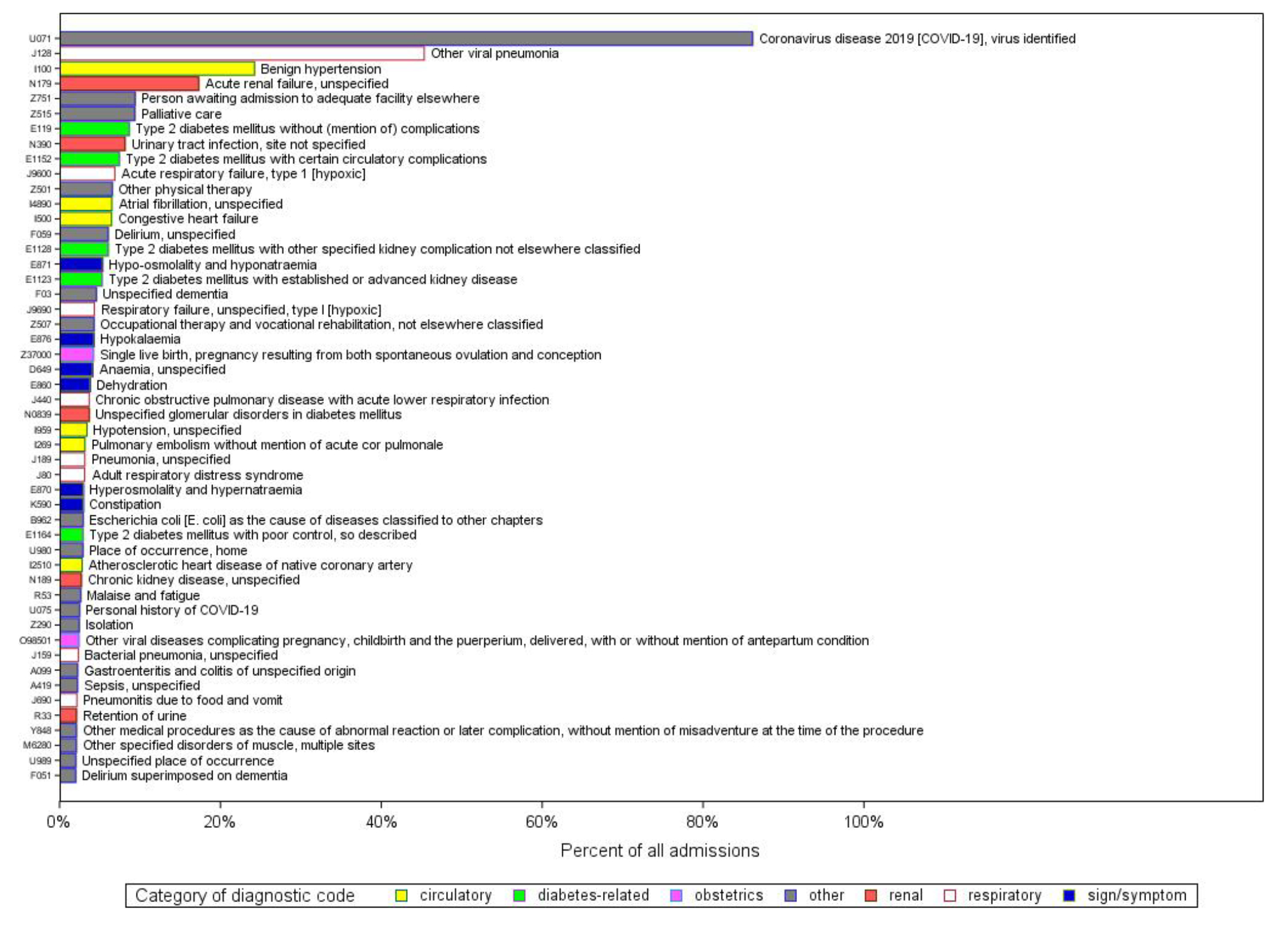 The hypothesis-generating nature of this study is another strength of this work. The most common post-admission diagnosis was SARS-CoV-2, which may represent a subset of patients who contracted SARS-CoV-2 during their hospital admission or were diagnosed incidentally during their admission [51]. The next most common post-admission diagnoses included urinary tract infection and acute renal failure [51]. Acute kidney injury has been documented as a common and serious adverse event associated with SARS-CoV-2 infection. Acute kidney injury is a risk factor for end-stage renal disease [52], but whether this relationship holds when SARS-CoV-2 is the aetiological agent remains to be established. These represent important avenues for future work.