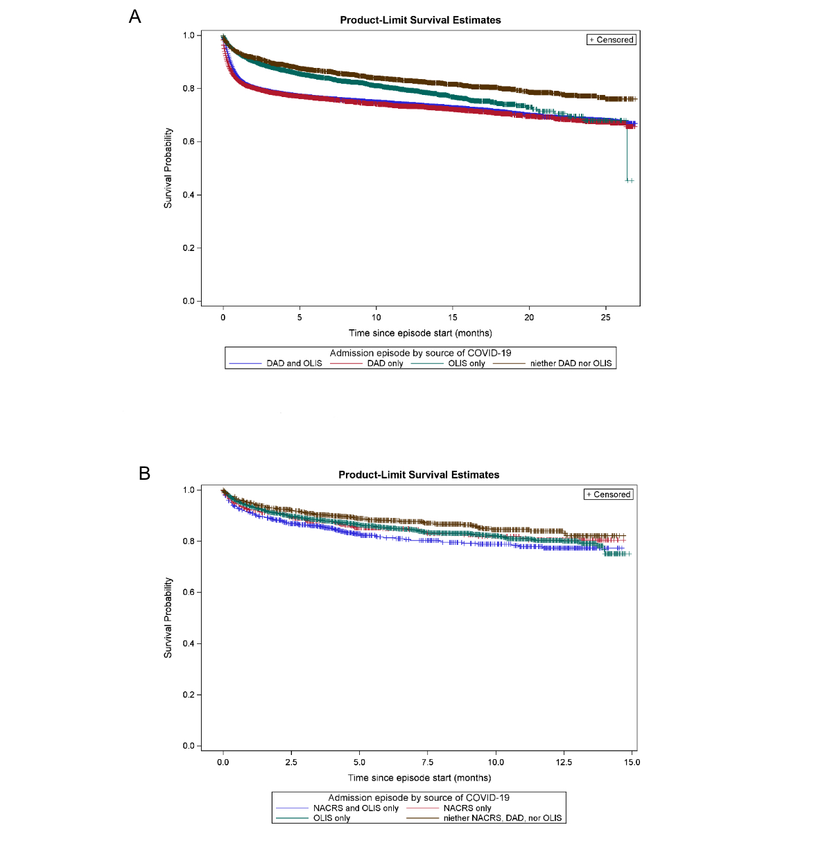Among the 63,601 SARS-CoV-2-related admissions according to DAD, 44,931 (71%) had a corresponding Ontario Laboratories Information System record during the admission and 57,151 (90%) had an OLIS record during the admission or within 2 weeks prior (figure A1). Similarly, 26,867 (42%) and 38,130 (60%) had corresponding evidence in NACRS during the admission and/or within 2 weeks prior to the admission episode, respectively. Among the 40,464 admissions with evidence of SARS-CoV-2 in NACRS (during or within 2 weeks prior), OLIS corroborated 36,550 (90%) of these (during or within 2 weeks prior). Among the 6450 (10%) of DAD admissions without a corresponding OLIS record, 2672 (41%) had corresponding evidence in NACRS within 2 weeks before or during the admission. Using overall survival as an indicator for the definition of a SARS-CoV-2-related admission, when captured in DAD, overall survival curves were similar regardless of corroboration from OLIS (figure A2a). Among admissions not captured by DAD, survival curves were qualitatively similar if identified from NACRS, regardless of corroboration from OLIS (figure A2b). Additionally, whether defined by NACRS or OLIS, overall survival was worse than if absent from all sources.