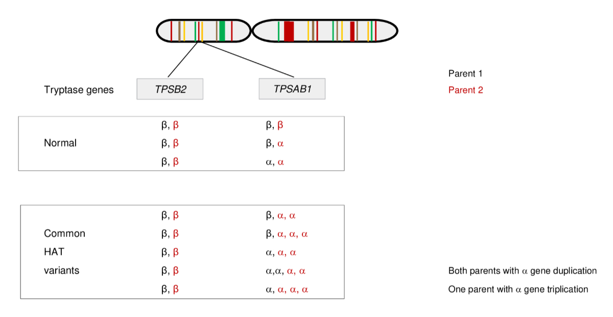 Figure 1Patterns of inheritance in alpha-tryptasemia (HAT) on chromosome 16p13.3 with different parenteral haplotypes. Alpha-tryptasemia is present when there is an excess of alpha tryptase encoding TPSAB1 copy numbers on one allele. An increased copy number can be inherited by one or by both parents. Common alpha-tryptasemia variants include alpha tryptase duplications or triplications. Adapted from Luskin KT, White AA, Lyons JJ. The genetic basis and clinical impact of hereditary alpha-tryptasemia. J Allergy Clin Immunol Pract. 2021;9(6):2235–42. https://doi.org/10.1016/j.jaip.2021.03.005, with permission from Elsevier.