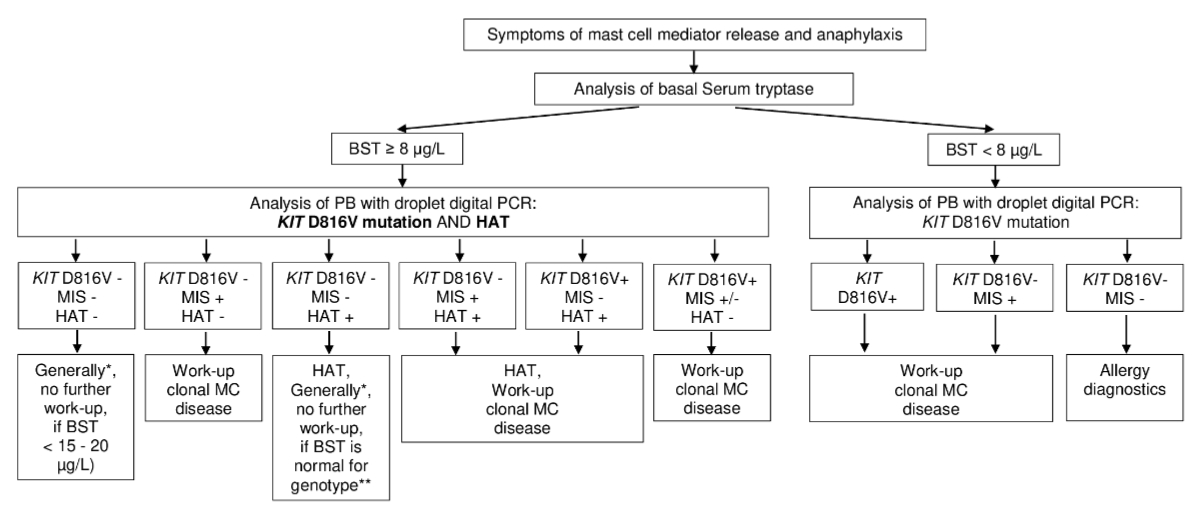 The proposed algorithm for the diagnostic workup of patients with symptoms of mast cell mediator release and anaphylaxis, considering clinical symptoms, basal serum tryptase, KIT D816V mutational status, genotyping for hereditary alpha-tryptasemia and presence or absence of mastocytosis in the skin is depicted in figure 2.