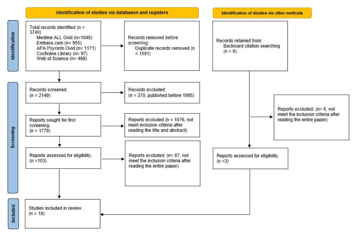 After removal of duplicates and studies published before 1995 (figure 1), the literature search yielded 1779 potentially relevant articles. We excluded 1676 articles after review of titles and/or abstracts. We analysed the full text of the 103 remaining studies; 87 of them did not meet eligibility criteria and were excluded. Furthermore, we found 9 further articles via other methods that could potentially be included in the review. After reading these articles, only 3 of them met the criteria for inclusion. In total, we selected 19 articles (figure 1).