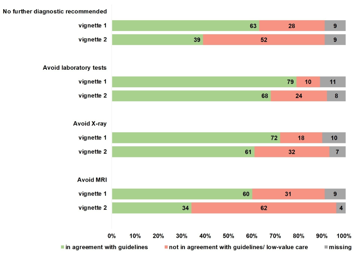 X-rays were recommended in vignette 1 by 18% of respondents and in vignette 2 by 32%; MRI imaging by 31% in vignette 1 and by 62% in vignette 2 (table 2). Figure 3 depicts the proportion of GPs in agreement with the guideline’s recommendations and the proportion using low-value diagnostic tests.