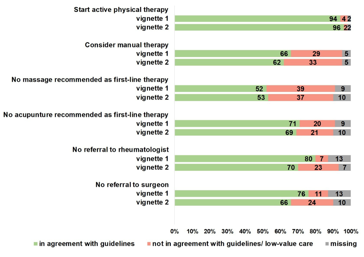We defined low-value care as diagnostic tests and management not in agreement with current guidelines. We used guidelines from the National Institute for Health and Care Excellence (NICE) in England [14], the American College of Physicians (ACP) [30] and Choosing Wisely recommendations [29]. We also consulted systematic reviews of clinical guidelines on management of low back pain published in The Lancet [11, 13], European Spine Journal [12] and European Journal of Pain [31, 32]. Appendix 1 summarises the detailed definitions and cut-offs of guideline adherence and low-value care for diagnostic approaches, pharmacological and non-pharmacological treatments, referral to specialist and recommendations for activity and work. Since there were no red flags and no neurological deficits in both vignettes and both patients had no previous treatment, we considered responses as guideline-adherent if GPs “never or rarely” performed imaging studies, laboratory tests, referred the patient to a specialist, prescribed muscle relaxants, steroids, long-acting opioids, spinal injection, homeopathy, massage and acupuncture. We considered the use of NSAIDs and metamizole as guideline-adherent for pain control. Guideline recommendations for paracetamol changed over time and paracetamol was no longer recommended as a first-line therapy or monotherapy for pain [33]. Thus, we defined as guideline-adherent if it was never, rarely or occasionally considered. Because our response options did not allow to assess whether a pain medication was prescribed in combinations or as-needed, we assessed co-prescription of paracetamol with NSAIDs that had been shown to be potentially beneficial [34]. The guidelines recommend active physical and manual therapy in selected patients [13]. We defined as guideline-adherent if active physical and manual therapy were considered occasionally or more in both vignettes because some evidence indicates that manual and active physical therapy may help to rapidly decrease pain and educate the patients [35]. In both vignettes, risk factors for chronification (lifting heavy weights, previous episode of low back pain) [36, 37] were present and therefore active physical and manual therapy were considered appropriate. We considered advice to stay active without any restrictions and to continue to work as guideline-adherent.