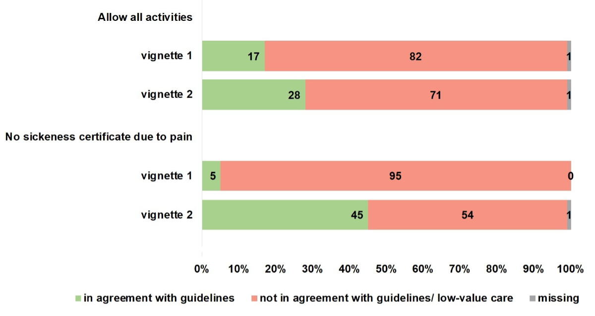 Table 2Proportion of general practitioners (GPs) managing patients with non-specific low back pain in agreement with clinical guidelines (vignette 1, n = 1253; vignette 2, n = 1226).