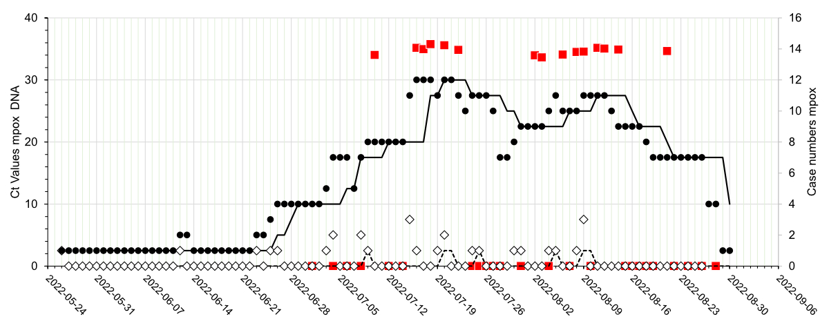 Figure 1Detection of mpox virus DNA in wastewater in relation to mpox (mpox) case numbers in the catchment area of the city of Basel during the indicated time period. The mpox virus DNA status of the wastewater samples (n = 39) is indicated (red-filled squares; negative samples on the x-axis, positive samples shown by their Ct values). Open diamonds represent the number of newly reported mpox cases, and closed circles represent the number of symptomatic patients. The corresponding seven-day median curves are shown by black lines (dashed line: newly reported cases, solid line: symptomatic cases). The results of 48- and 72-hour pooled samples were attributed to the corresponding later date.