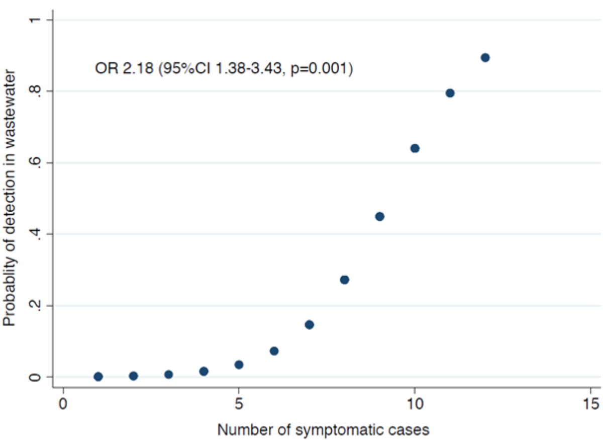 In the logistic regression analyses, the positivity of the wastewater samples was significantly associated with the number of symptomatic cases (OR = 2.18, 95% confidence interval [CI] = 1.38–3.43, p = 0.001) (figure 2) and with the seven-day median of symptomatic cases (OR = 1.54, 95% CI = 1.03–2.30, p = 0.035). However, it was not associated with the number of daily cases (OR = 1.23, 95% CI = 0.53–2.90, p = 0.629) or their seven-day median (OR = 1.69, 95% CI = 0.21–13.87, p = 0.624).