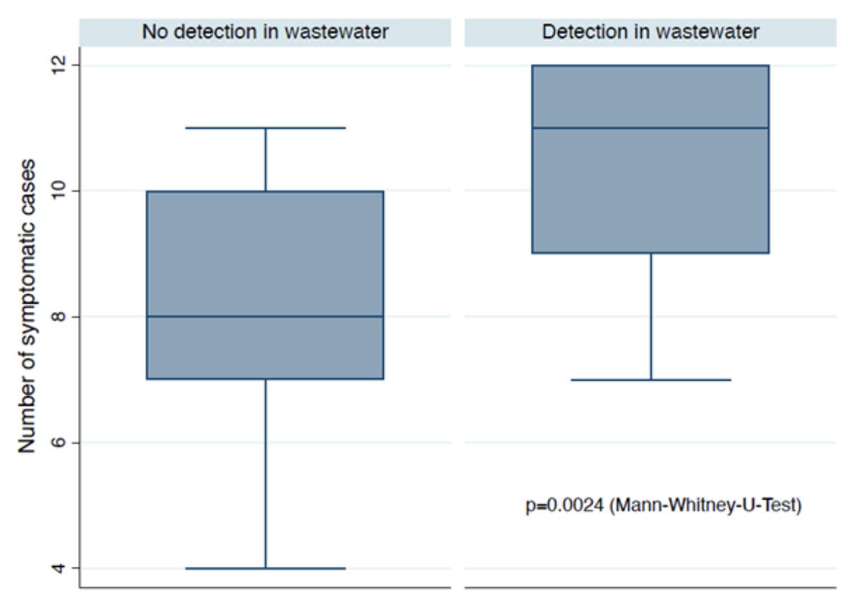 Figure 3Box plots of the number of symptomatic mpox cases on days with and without mpox virus DNA detected in wastewater.