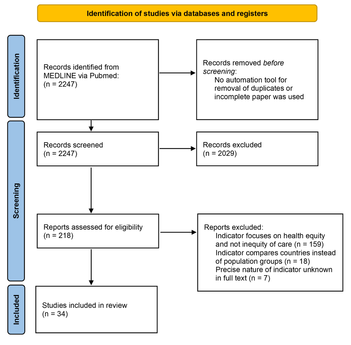 The review included articles that described inequities in care or in access to care in Switzerland, or studies about programmes to improve healthcare equity in Switzerland. The literature search included publications from 1980 to 2021, concerning outpatient or inpatient care. We searched MEDLINE with the search terms “(Swiss OR Switzerland) and (Equity OR Inequity)” on 17 November 2021. This strategy yielded a total of 2247 citations. One author (CB) read each title and abstract to select articles using indicators and then extracted the definitions of the indicators and stratifiers from the full text of the articles.
