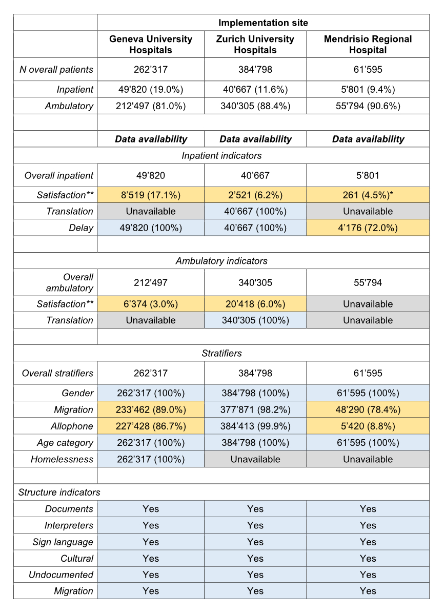 To summarise, this feasibility study showed three levels of availability for the proposed indicators. First, indicators based on routine data such as “Delay in care”, or “Translation” at USZ were largely available (>90%, in green in table 1). Second, indicators requiring extra effort to be assessed were partially available (>0–90%, in yellow in figure 2). The availability of patient satisfaction data, for instance, depends in large part on the survey response rate. Lastly, some indicators were fully unavailable (in grey in figure 2), usually due to a lack of required variables in the information system, such as “receiving a translation” at HUG and EOC.