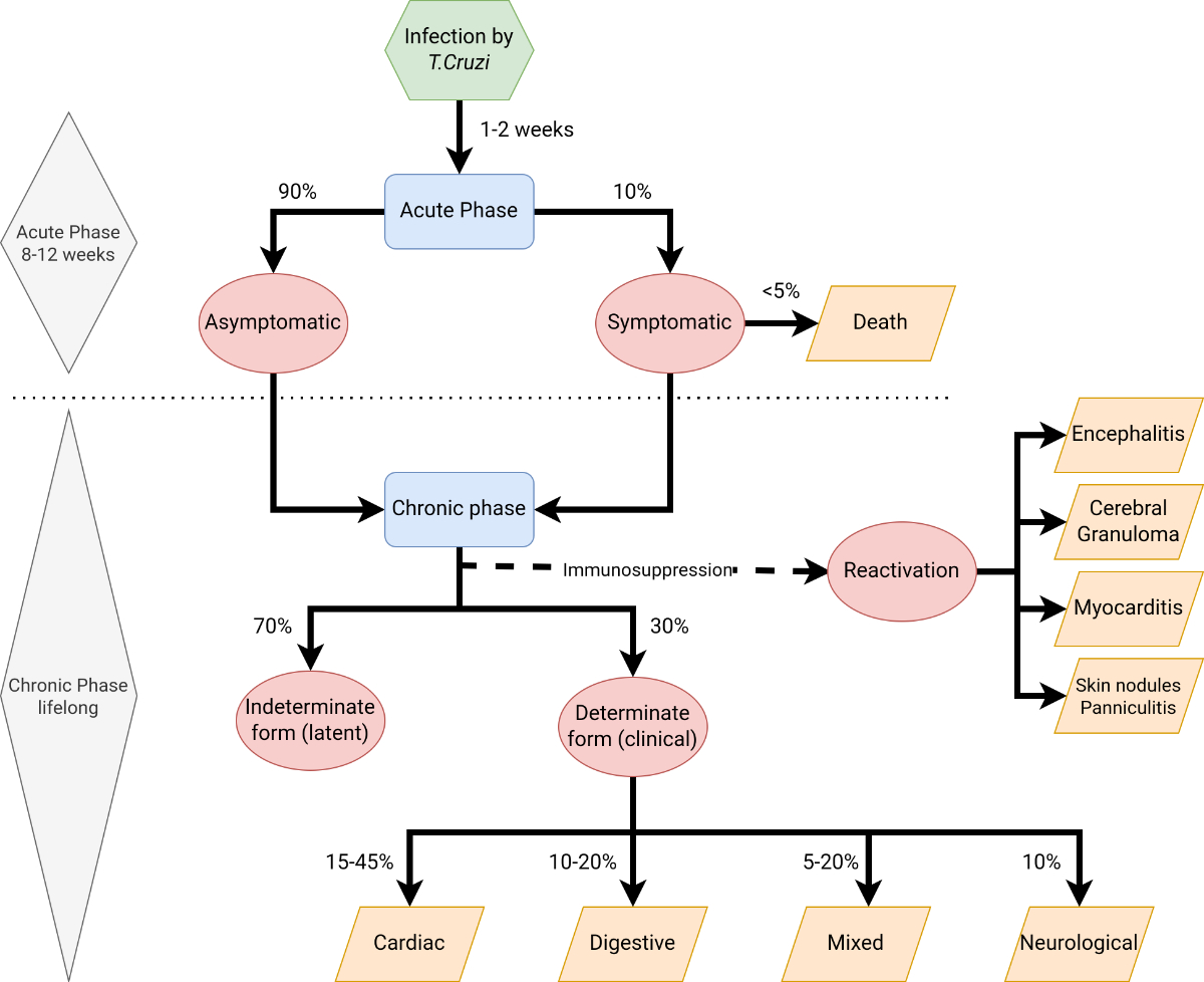 In the absence of early antitrypanosomal therapy, this transition generally occurs at around 8 to 12 weeks after the onset of infection, and the chronic phase typically persists throughout the patient's lifetime; spontaneous remission is rare [28, 29]. The chronic phase encompasses the indeterminate (latent) form and the determinate (clinical) forms, which are marked by different degrees of organ damage (classified as cardiac, digestive, neurological, or mixed). The majority of individuals infected with T. cruzi remain in the indeterminate phase throughout their lives. Based on clinical series from the 1980s [30, 31] it is estimated that 30% to 40% of chronically infected individuals develop long-term complications (determinate form) after a latent period spanning from 10 to 30 years [32]. Recent clinical series have reported a progression rate towards cardiac involvement of 1.4–5% per year, which can vary between endemic and non-endemic areas [33, 35]. Approximately 15% to 45% of chronically infected individuals develop cardiomyopathy [34, 36, 37], and 10% to 20% present gastrointestinal damage [38, 39]; some individuals show overlapping syndromes (5–20% of those patients with cardiomyopathy). In addition, 10% of individuals present with mild sensory neuropathy [40, 41].