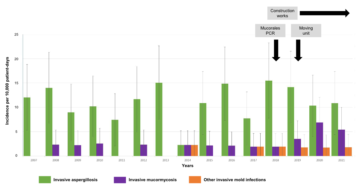 All episodes of proven or probable invasive mould infections, according to the European Organisation for Research and Treatment of Cancer and Mycoses Study Group Education and Research Consortium (EORTC-MSGERC) [12], were extracted from the ward registry for the period 2007–2021. Incidence of proven or probable invasive aspergillosis, invasive mucormycosis and other NAIMI were expressed for each year in the number of cases per 10,000 patient-days with expression of the 95% confidence interval (CI).