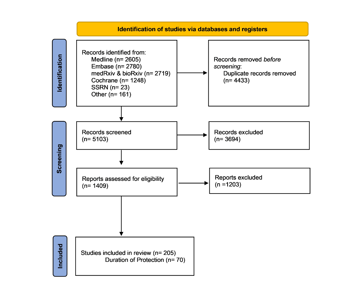 A total of 9536 studies were found using the search queries; 5103 studies remained after the removal of duplicates. After title and abstract screening by two authors, 1409 studies were included for full-text review. After full-text review, 205 articles were included in this review. Of the 205 articles, 70 addressed the duration of protection against SARS-CoV-2 infection and were highlighted in the review (figure 1). Further details on the characteristics of the included studies can be found in table S1 in the appendix. The review was mandated by the Federal Office of Public Health, and detailed reports can be found on their website (https://www.bag.admin.ch/bag/en/home/das-bag/publikationen/forschungsberichte/forschungsberichte-uebertragbare-krankheiten/forschung-wissenschaft-covid-19.html) (under the “Literature searches” section and “Monitoring COVID-19 immunity” subsection).