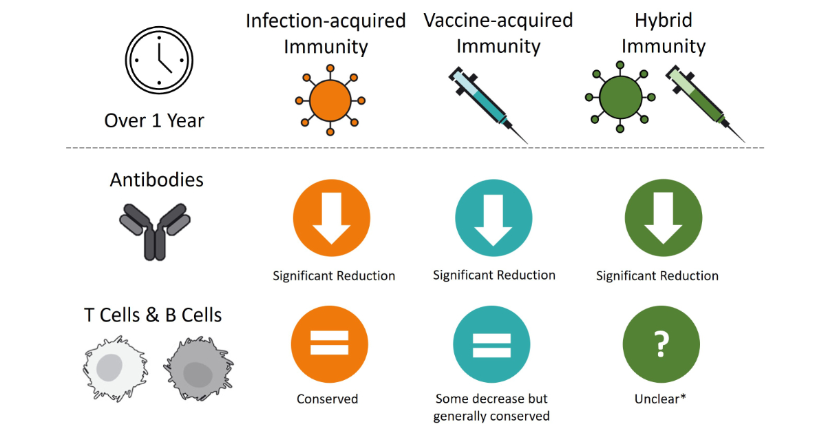 Figure 2Visual summary comparing the levels of antibodies and T and B cells from day 1 to day 365 (over a 1-year period) for infection-acquired, vaccine-acquired and hybrid immunity. This figure provides a generalised summary based on the included studies. The designs, durations and results of the included studies were very heterogenous, allowing for only a very generalised summary. * Few studies with results on the duration of the protection of hybrid immunity were included in the review and used to draw conclusions; nonetheless, it is safe to assume that similar trends in infection-acquired immunity can be expected.