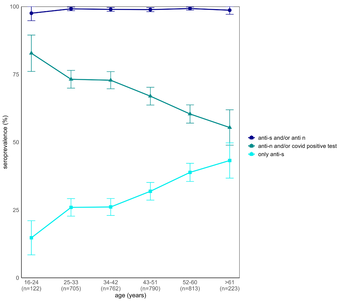 Among 3,414 study participants with available blood samples, 3,379 (99.0%) showed anti-S antibodies (3,357, 98.3%), anti-N antibodies (2,396, 70.1%), or both (2,370, 69.4%). Among vaccinated healthcare workers, 51.6% had a positive COVID-19 test at some point (before or after vaccination) during the study, compared with 81.1% of unvaccinated healthcare workers (p <0.001). Among 1,889 participants with self-reported positive SARS-CoV-2 swab tests, 1,675 (88.7%) had anti-N positivity; in contrast, among all participants with anti-N positivity, 77% (1,675 of 2,173) reported a positive SARS-CoV-2 swab test. Whereas previous infection was more common in younger participants, vaccination rates increased with age (figure 3).