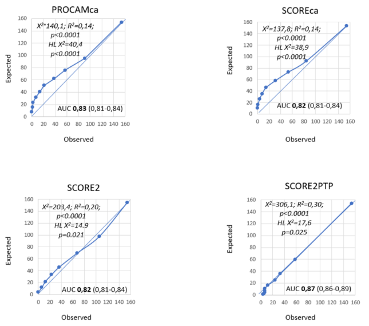Table 2 shows the discrimination of MACE and ASCVD using area under the curve (AUC) for PROCAM, PROCAMcvd, SCORE, SCORE2, SCORE2ptp and TPA. For the discrimination of MACEs, all AUCs were between 0.83 and 0.86 with significantly better discrimination for SCORE2ptp vs SCORE2 and vs TPA. For the discrimination of ASCVD, we found PROCAM vs PROCAMcvd p = 0.0002; PROCAM vs SCORE2PTP p = 0.0001; PROCAM vs TPA p = 0.0006; PROCAMcvd vs SCORE2PTP p = 0.0008; PROCAMcvd vs TPA p = 0.0049; SCORE vs SCORE2PTP p <0.0001; SCORE vs TPA p = 0.0004; SCORE2 vs SCORE2ptp p <0.0001; SCORE2 vs TPA p = 0.0001; all others p = non-significant. Figure S1 in the appendix shows the AUC for ASCVD.