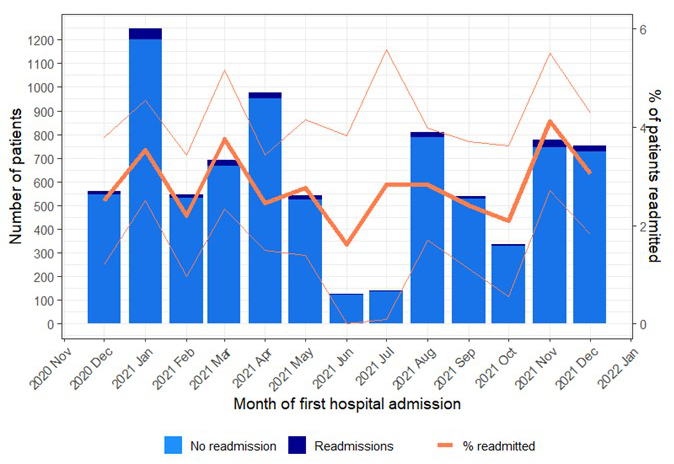 The CH-SUR hospital readmission rate over time is presented in figure 1. It varied between 1.6% (95% CI 0.0–3.8%) (June 2021) and 4.6% (95% CI 3.2–6.1%) (November 2021).
