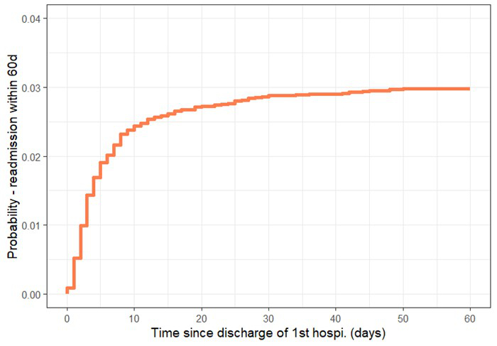All analyses were conducted in R (version 4.2.1). First, we compared the baseline characteristics of readmitted and non-readmitted patients, via Chi-squared tests for categorical variables. Then, we calculated cumulative incidence functions (CIFs) for hospital readmission, overall and stratified by variables, using the R package mstate [19]. We also present descriptive statistics of the conditions and events during the second hospitalisation among the patients who were readmitted within 60 days of first discharge.
