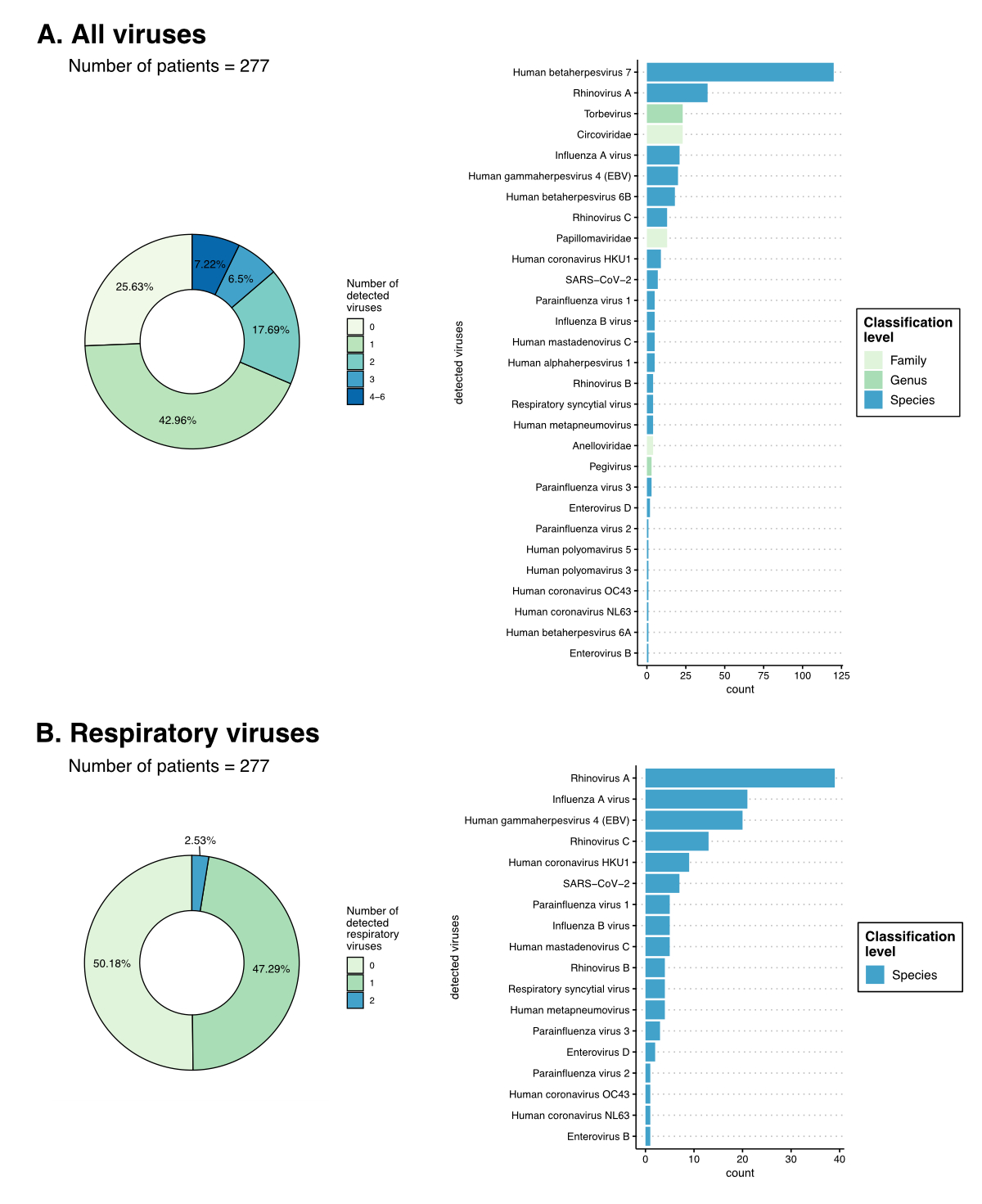 Figure 1The distribution of the number of viruses detected per participant (doughnut chart) and the number of different virus species detected overall (bar chart) is shown for (A) all viruses and (B) viruses causing respiratory tract infections.