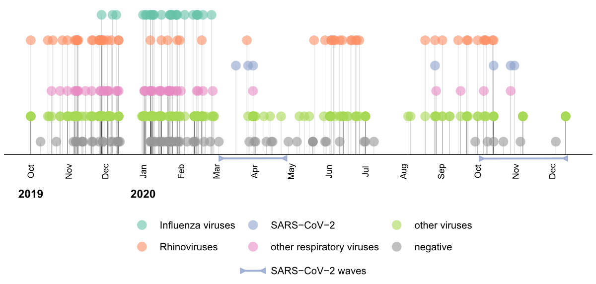 Figure 2A timeline of the study visits and detected viruses throughout the study period from October 2019 to December 2020. Negative and positive sequencing results (grey and coloured circles, respectively) are shown for each study visit. The detection of influenza viruses (green), rhinoviruses (orange), SARS-CoV-2 (blue), respiratory viruses other than rhinoviruses and SARS-CoV-2 (pink), and other non-respiratory viruses (green) is highlighted separately. The two SARS-CoV-2 waves in Switzerland within the studied period are indicated by blue bars.