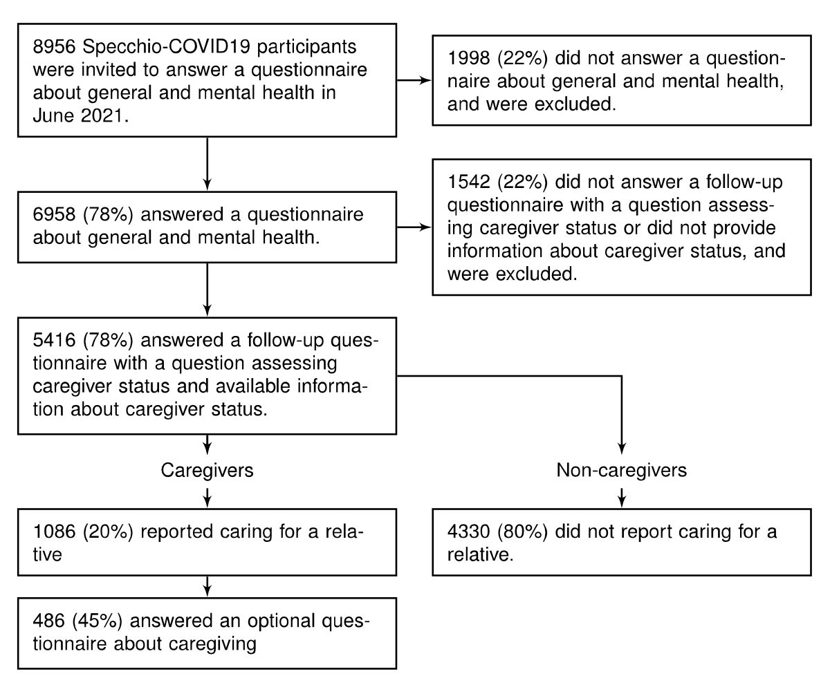 Participants in the Specchio-COVID19 study were eligible for this analysis if they had completed (a) a questionnaire about general and mental health and (b) a follow-up questionnaire with a question assessing caregiver status (figure 1).