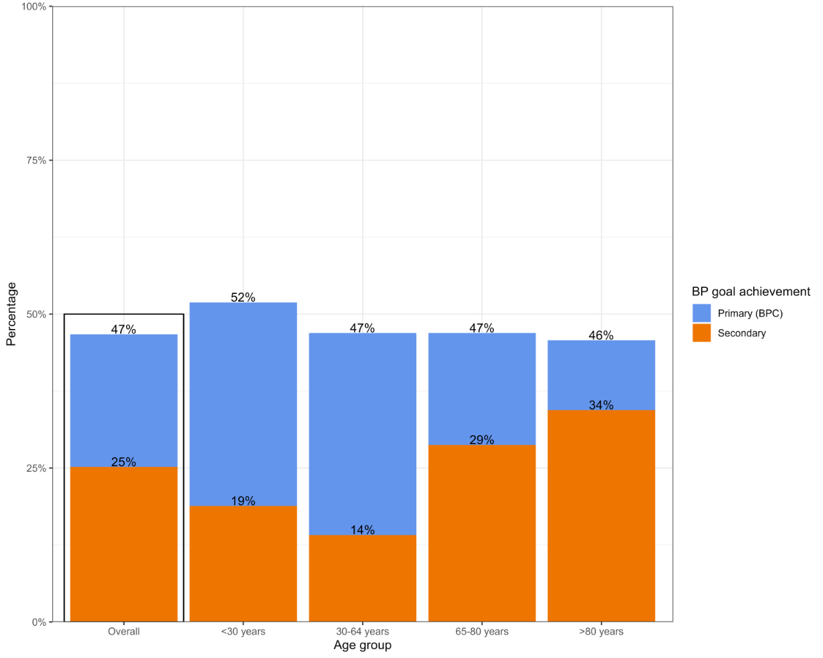 Figure 1Blood pressure control (BPC) (defined as achieving systolic <140 mm Hg and diastolic <90 mm Hg) and achievement of the secondary blood pressure goal (systolic <130 mm Hg, or <140 mm Hg if aged ≥65 years, and diastolic <80 mm Hg). Percentages are reported overall and stratified by patient age group. BP: blood pressure.